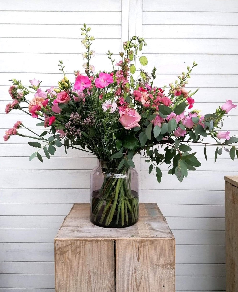 € 200 Groot: 12x kleine tafelvaasjes voorgevuld, 1x groot boeket in vaas